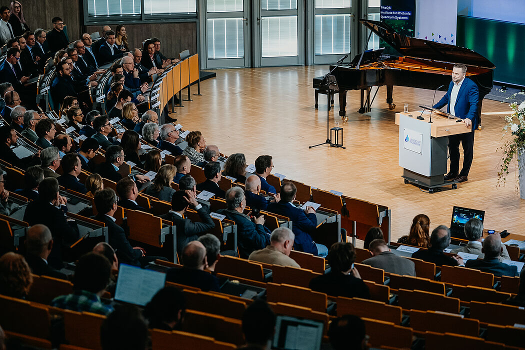 Vertreter*innen aus Politik, Wissenschaft und Wirtschaft würdigten die Paderborner Spitzenforschung im Bereich der Quantenphotonik, die das Potenzial hat, die digitale Welt grundlegend zu verändern. Denn photonische Anwendungen, also solche, die auf Licht basieren, sind besonders wichtig für die künftige Kommunikation, den Datentransfer oder die Sensorik. Durch den Aufbau eines wissenschaftlichen Ökosystems entstehen nationale sowie internationale Partnerschaften mit führenden Institutionen und Unternehmen, die die Innovationskraft der Region steigern. „Mit dem PhoQS Lab eröffnen wir in Nordrhein-Westfalen ein einzigartiges Forschungsgebäude für eine der wichtigsten Zukunftstechnologien unserer Zeit. Quantentechnologien werden unsere Wirtschaft, unsere Kommunikation und unseren Alltag grundlegend verändern. Hier in Paderborn entstehen die Ideen und Innovationen, die über technologische Wettbewerbsfähigkeit, neue Arbeitsplätze und nachhaltigen Wohlstand entscheiden. Nordrhein-Westfalen zeigt damit: Wir wollen die technologische Revolution aktiv mitgestalten und international Maßstäbe setzen. Mit gezielten Investitionen in Spitzenforschung stärken wir unseren Standort nachhaltig und schaffen die Grundlage dafür, dass Zukunftstechnologie ‚Made in NRW‘ weltweit gefragt ist. Das PhoQS Lab steht exemplarisch für unseren Anspruch, Nordrhein-Westfalen als führendes Innovations- und Technologieland in Europa weiter auszubauen und für unser Ziel, die technologische Souveränität unseres Landes zu stärken“, so Ministerpräsident Wüst.
