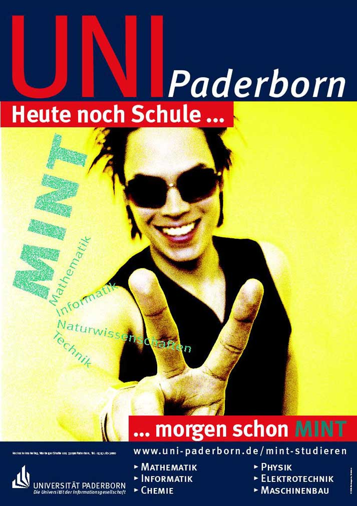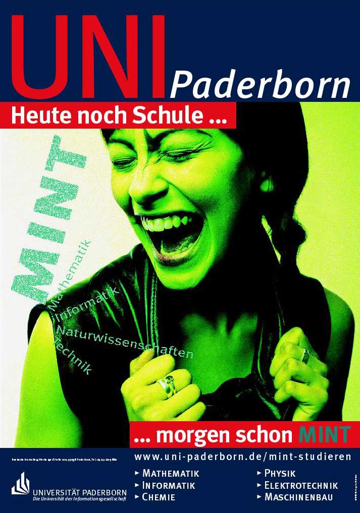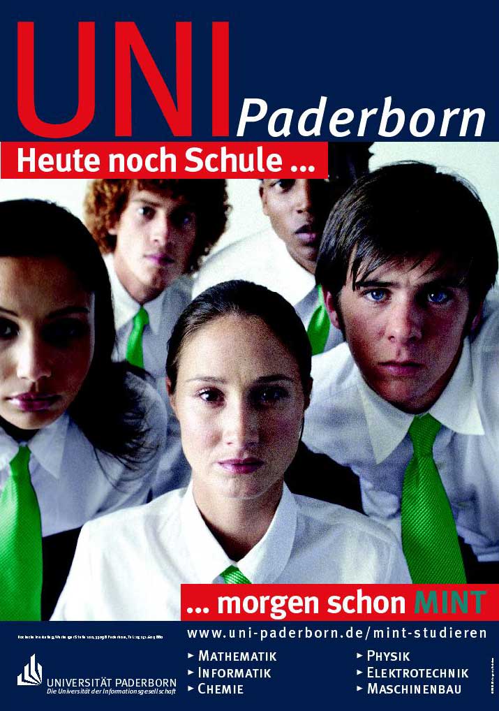 Unter dem Motto „Heute noch Schule, morgen schon MINT“ wurden drei Plakatmotive entwickelt, die bundesweit an insgesamt 93 zertifizierten MINT-Schulen und 14 MINT-Anwärterschulen zum Einsatz kommen. Regional wurde und wird die Werbeaktion durch den Aushang von CityLightPostern in den Städten Paderborn, Kassel, Bielefeld, Gütersloh, Minden und Herford intensiviert. Die Poster haben dabei ein großflächiges Format von 1,19 m Breite und 1,75 m Höhe und beeindrucken mit einer Hinterleuchtung. Auffällig sind die Motive zudem durch die farblich markante Gestaltung, welche für eine junge und innovative Universität steht. Insgesamt wurden etwa 500 Werbeflächen mit den CityLightPostern bestückt.