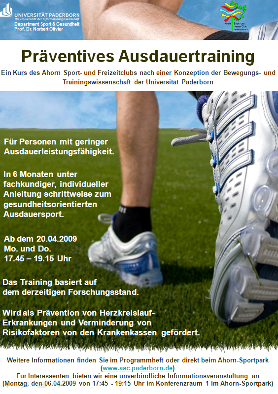 Interessenten erhalten weitere Informationen täglich ab 10.00 Uhr unter Tel.: 05251-13711-43 sowie im Internet auf der Homepage des Ahorn Sport- und Freizeitclubs (www.asc-paderborn.de). Außerdem wird am Montag, 6.4.2009 (17.45-19.15 Uhr im Konferenzraum 1), eine unverbindliche Informationsveranstaltung über den Kurs im Ahorn-Sportpark angeboten. Hier erhalten Sie genauere Informationen von den Übungsleitern und können Fragen stellen.