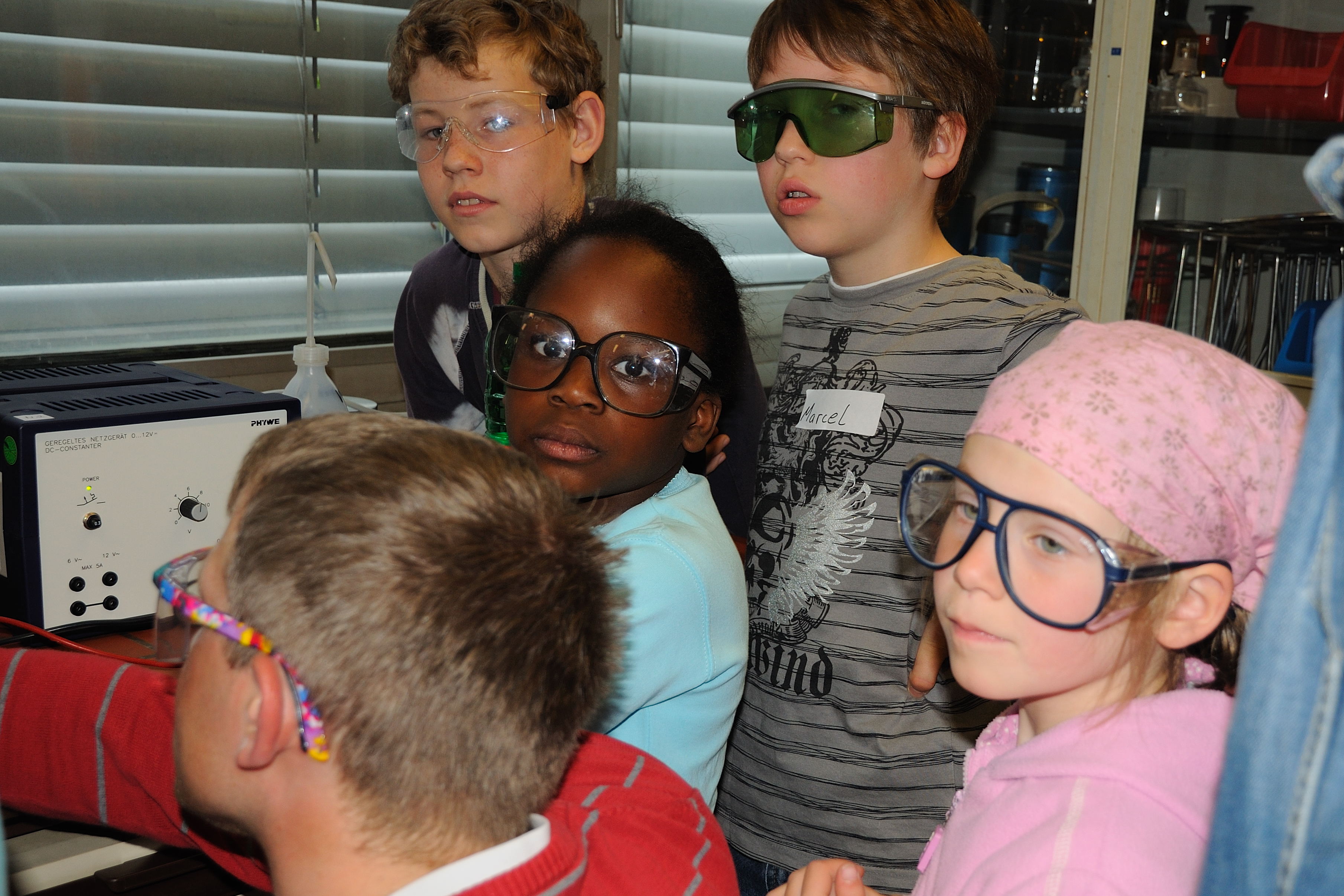 In der zweiten Ferienwoche untersuchten neun junge Forscherinnen und Forscher beim Workshop der Chemiedidaktik die Eigenschaften von verschiedenen Flüssigkeiten und Getränken. Mit Hilfe von Leitfähigkeitsuntersuchungen wurde der Frage nachgegangen, warum Mineralwasser besser Strom leitet als normales oder destilliertes Wasser. Als geübte kleine Chemikerinnen und Chemiker extrahierten die Kinder am letzten Tag in einer Versuchsreihe Orangenlimonade in ihre Bestandteile, Farbstoffe, Aromen, Zucker und Gas, während in der Informatik am PC mit Hilfe verschiedenster Programme und Tools ein eigenes Zauberbuch gebastelt wurde. In der Elektrotechnik konnten die Kinder zunächst kreativ und phantasievoll mit Hilfe von alten Bauteilen und Platinen das Löten üben, bevor sie an einem elektronischen Würfel bastelten und so die Gesetze der Elektronik kennenlernten.
