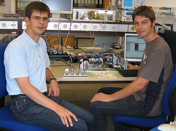 Zum 1. August starteten Dipl.-Ing. Benjamin Koch, Dr.-Ing. Vitali Mirvoda und weitere Mitarbeiter des Fachgebiets Optische Nachrichtentechnik und Hochfrequenztechnik gemeinsam mit Prof. Dr. Reinhold Noé die „Weiterentwicklung eines endlosen Hochgeschwindigkeitspolarisationsreglers für die optische Nachrichtentechnik“. Ziel ist es, die Datenübertragungsraten in Glasfaserkabeln auf besonders kostengünstige Weise zu verdoppeln. Dabei werden unabhängige Datenströme zwei zueinander senkrechten Schwingungsebenen des Laserlichts aufgeprägt. Gegenwärtig können die Paderborner Elektrotechniker empfängerseitig in jeder Sekunde bis zu 3000 volle Drehungen der Schwingungsebene oder Polarisation des Lichts mit einem optischen Lithiumniobat-Bauelement unterbrechungsfrei nachverfolgen. Dieser Wert ist derzeit weltweit konkurrenzlos. Damit können die in der Glasfaser durch Hantieren oder Erschütterungen auftretenden, deutlich langsameren Polarisationsänderungen ohne weiteres ausgeregelt werden.
