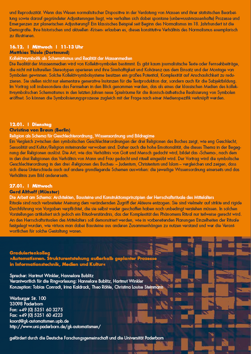 Das im Mai 2008 an der Universität Paderborn eingerichtete DFG-Graduiertenkolleg  versteht Automatismen als Abläufe, die sich einer bewussten Kontrolle weitgehend entziehen; es versammelt Dissertationsprojekte, die Automatismen im Feld der Medien, der Informationstechnik und der Kultur untersuchen. Konstitutiv ist der Brückenschlag zwischen Kulturwissenschaft und Informatik. Weitere Informationen unter: www.upb.de/gk-automatismen.