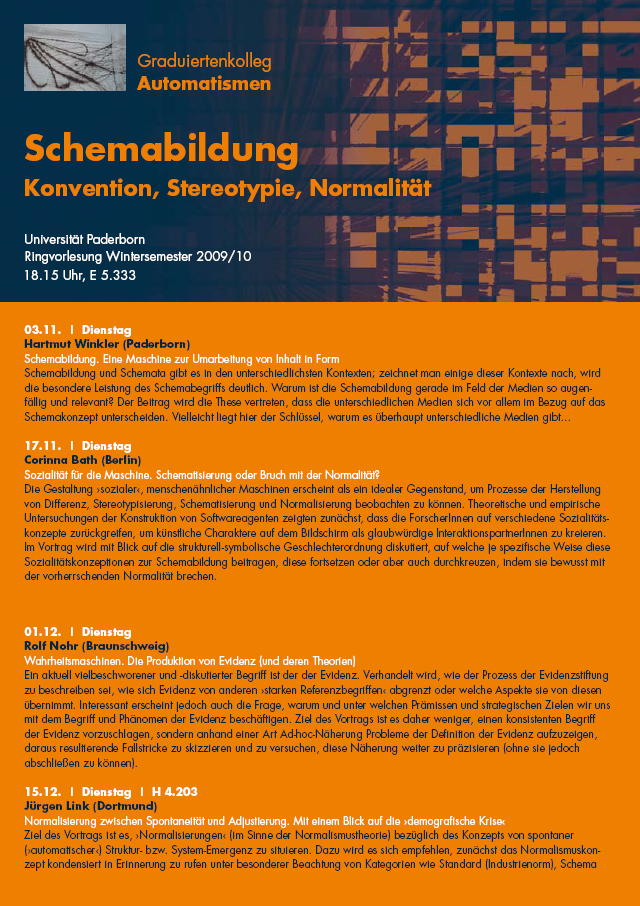 Die Ringvorlesung des Paderborner Graduiertenkollegs „Automatismen“ behandelt in diesem Semester das Thema „Schemabildung. Konvention, Stereotypie, Normalität“. Am 3. November eröffnet der Sprecher des Kollegs, Prof. Dr. Hartmut Winkler (Institut für Medienwissenschaft), die Ringvorlesung mit einem Einführungsvortrag. Die Veranstaltung findet in Raum E 5.333 statt und beginnt um 18.15 Uhr.