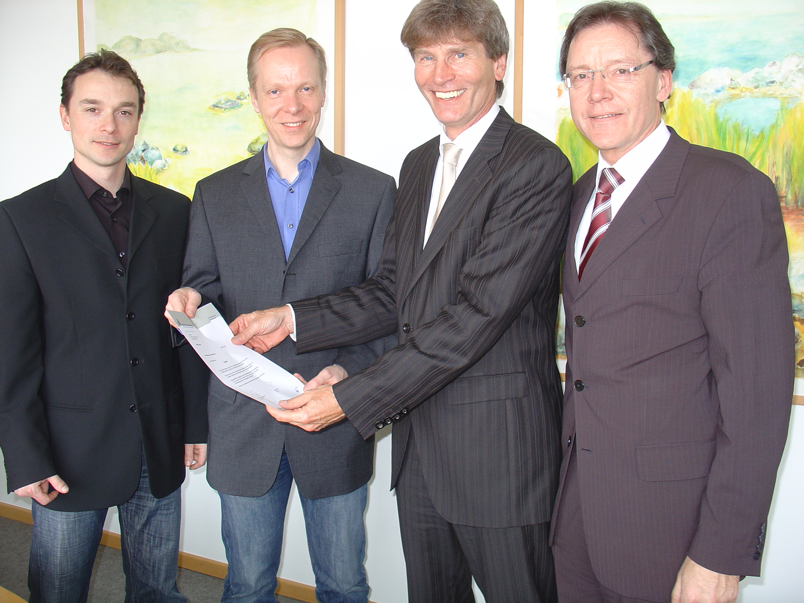 Foto (v. li.): Dr. Mike Bobert und Dr. Hans Egold (Vorstand Alumni Chemie e. V.), Präsident Prof. Dr. Nikolaus Risch und Christoph Schön (Stabsstelle Präsidium Hochschulnetzwerk und Fundraising).