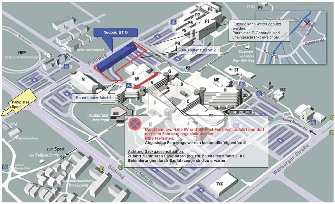 Im Dezember wurde auf dem Campus der Universität die Baustelle für den Neubau des Gebäudes O am Pohlweg eingerichtet. Für die Bauausführung mussten großflächig Teilbereiche der Parkplätze an der Halle IW – voraussichtlich bis zum Sommer 2011 – gesperrt werden (siehe Plan). Es wird um Verständnis für die Sperrung der genannten Parkplätze gebeten.