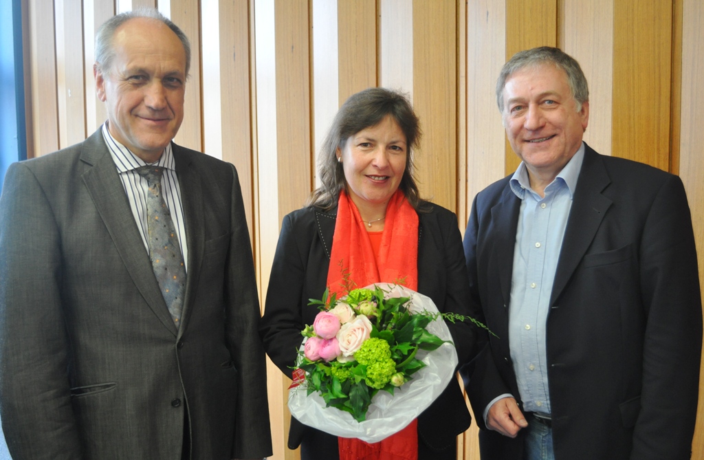 Foto (Universität Paderborn, Mark Heinemann): Der Rat der Fakultät Elektrotechnik, Informatik und Mathematik um Dekan Prof. Dr. Franz J. Rammig (l.) und Geschäftsführer Dr. Michael Laska wählte Prof. Dr. Angela Kunoth zur neuen Prodekanin des Instituts für Mathematik.
