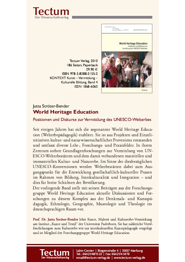Im Jahr 2008 wurde ein Forschungsverbund im Rahmen der bundesweiten Implementierung einer World Heritage Education mit VertreterInnen verschiedener Universitäten und Welterbestätten gegründet. Ziel ist es, die Zusammenarbeit zwischen Welterbestätten und Hochschulen auf interdisziplinärer Ebene zu intensivieren, besser zu vernetzen und Grundlagen wie Inhalte der World Heritage Education an den wissenschaftlichen Diskurs anzubinden. Die ersten Forschungs- und Arbeitsergebnisse aus den Bereichen Denkmals- und Kunstpädagogik, Ethnologie, Geographie, Museologie und Theologie wurden jetzt von Frau Prof. Dr. Jutta Ströter-Bender, Fach Kunst, in dem Sammelband: „World Heritage Education. Positionen und Diskurse zur Vermittlung des UNESCO-Welterbes“ als Band 4 der Reihe: „KONTEXT: Kunst. Vermittlung. Kulturelle Bildung“ herausgegeben.