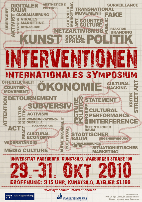 Vom 28. bis 31. Oktober 2010 findet an der Universität Paderborn das internationale und interdisziplinäre Symposium INTERVENTIONEN statt. Es führt WissenschaftlerInnen aus unterschiedlichen Disziplinen, KünstlerInnen und KuratorInnen in einem Dialog zum Thema INTERVENTIONEN zusammen. Anlass ist die Auseinandersetzung mit einer neuen Tendenz und transnationalen Bewegung an den Grenzen von Kunst, Politik und Ökonomie