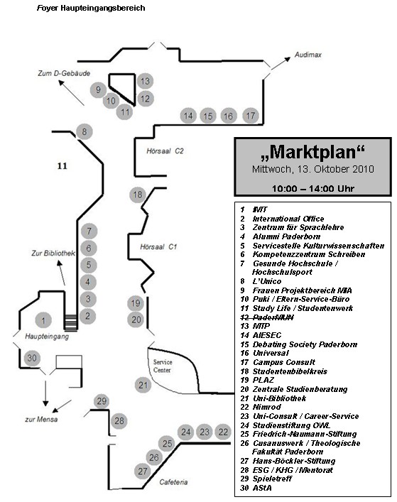 Doch unsere Universität bietet viel mehr: Serviceeinrichtungen wie Bibliothek und IMT, Hilfen und Erweiterungsangebote wie Zentrum für Sprachlehre und Kompetenzzentrum Schreiben, Begegnungen mit der Praxis bei UniConsult und Campus Consult, studentische Initiativen wie Spielekreis und Debating Society. Alle diese Institutionen und Initiativen stellten sich am 13.10. im Foyer vor der Bibliothek vor. Viele Erstsemester nutzten das Angebot, die Aussteller waren mit der Resonanz sehr zufrieden. Organisiert wurde der Markt durch die Zentrale Studienberatung, die auch mit einem Stand vertreten war.