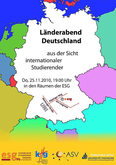 Die Antworten auf diese Fragen erhalten Sie am 25.11. um 19.00 Uhr beim Länderabend "Deutschland aus der Sicht internationaler Studierender" in den Räumen der ESG, am Laugrund 5.
