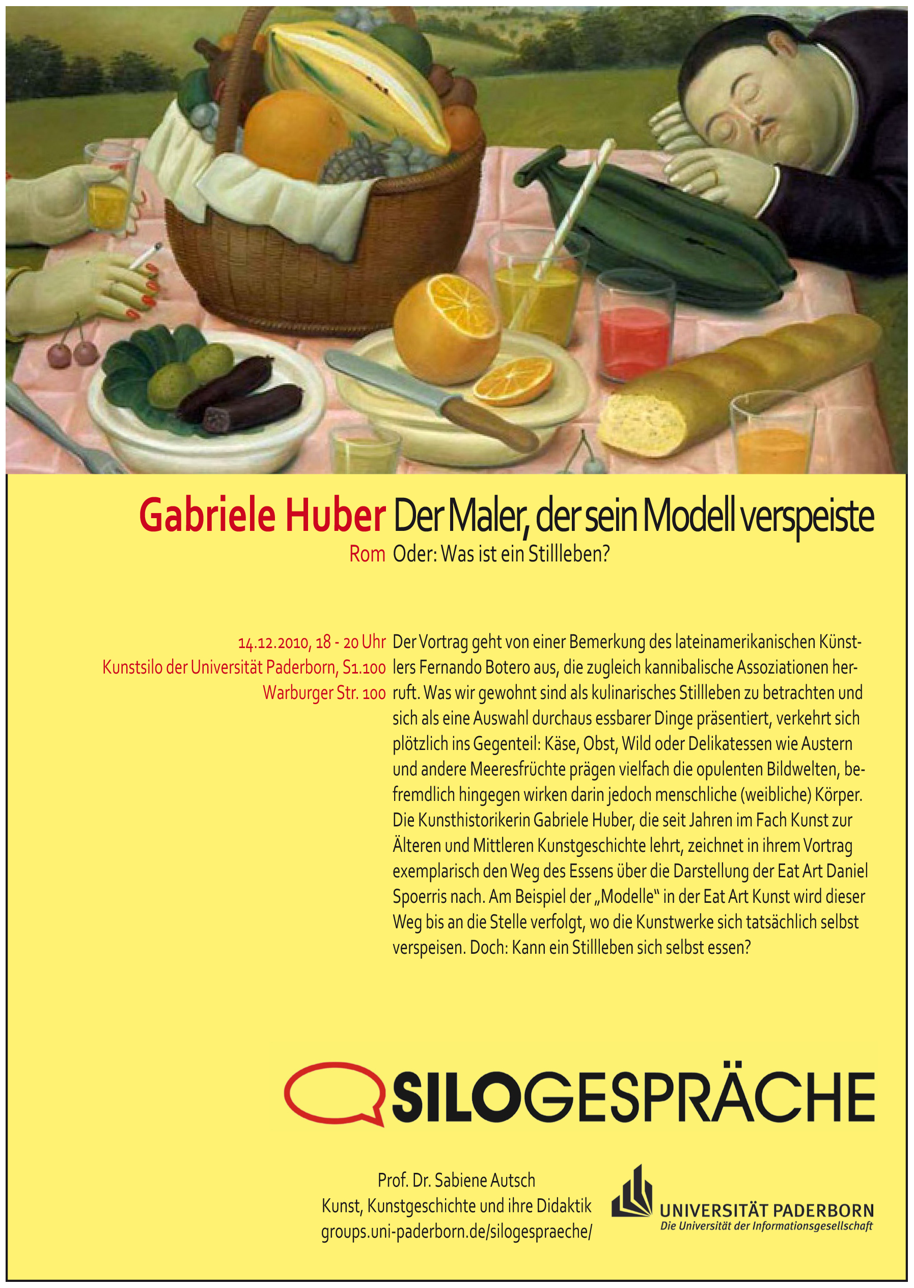 Die Einführung zur Person und zur Thematik des Silllebens hält Angela Salmen. Der Vortrag von Gabriele Huber geht von einer Bemerkung des lateinamerikanischen Künstlers Fernando Botero aus, die zugleich kannibalische Assoziationen herruft. Was wir gewohnt sind als kulinarisches Stillleben zu betrachten und sich als eine Auswahl durchaus essbarer Dinge präsentiert, verkehrt sich plötzlich ins Gegenteil: Käse, Obst, Wild oder Delikatessen wie Austern und andere Meeresfrüchte prägen vielfach die opulenten Bildwelten, befremdlich hingegen wirken darin jedoch menschliche (weibliche) Körper.