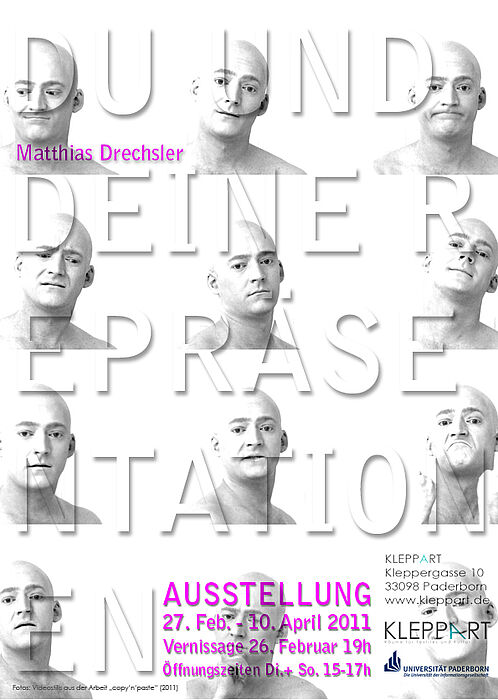 „Du und deine Repräsentationen“ so die Titelaussage der am Samstag beginnenden Ausstellung des Paderborner Kunst- und Germanistikstudenten Matthias Drechsler, die vom 27. Februar bis zum 10. April 2011 in der KleppArt in Paderborn präsentiert wird. Es werden Arbeiten in Form von Raum- und Videoinstallationen, Objekten, Bildhauerei und Collage zu sehen sein.