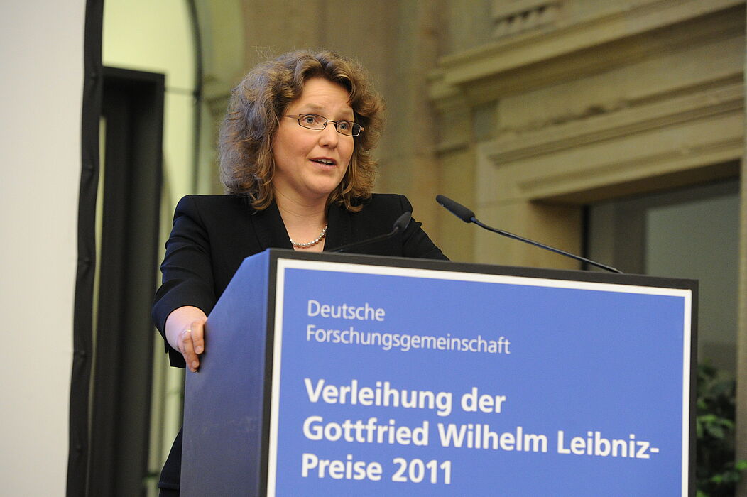 Zum Abschluss möchte ich noch auf den Patron des Preises, Gottfried Wilhelm Leibniz, zu sprechen kommen. Seine Arbeiten als Universalgelehrter sind so vielfältig und beeindruckend, dass wohl jeder Wissenschaftler einen ganz eigenen Bezug zu ihm herstellen kann. Für mich als Naturwissenschaftlerin sind seine wegbereitenden Arbeiten in der Mathematik sowie die Einführung des Dualsystems besonders beeindruckend. Dabei war Leibniz auf die Erfindung seiner Dyadik aus religiösen und philosophischen Gründen sehr stolz, wusste aber technisch wenig damit anzufangen. Die wahre Bedeutung und Tragweite dieser Ergebnisse erkennen wir erst heute nach über 300 Jahren mit der Entwicklung der Computertechnologie. Dies zeigt sehr eindrücklich, welch langer Atem manchmal in der Forschung nötig und wie wenig absehbar der eigentliche Nutzen von Wissenschaft ist. In diesem Sinne werden wir uns bemühen, das in uns gesetzte Vertrauen zu rechtfertigen und unseren Baustein für den gesellschaftlichen und wirtschaftlichen Fortschritt beizutragen.