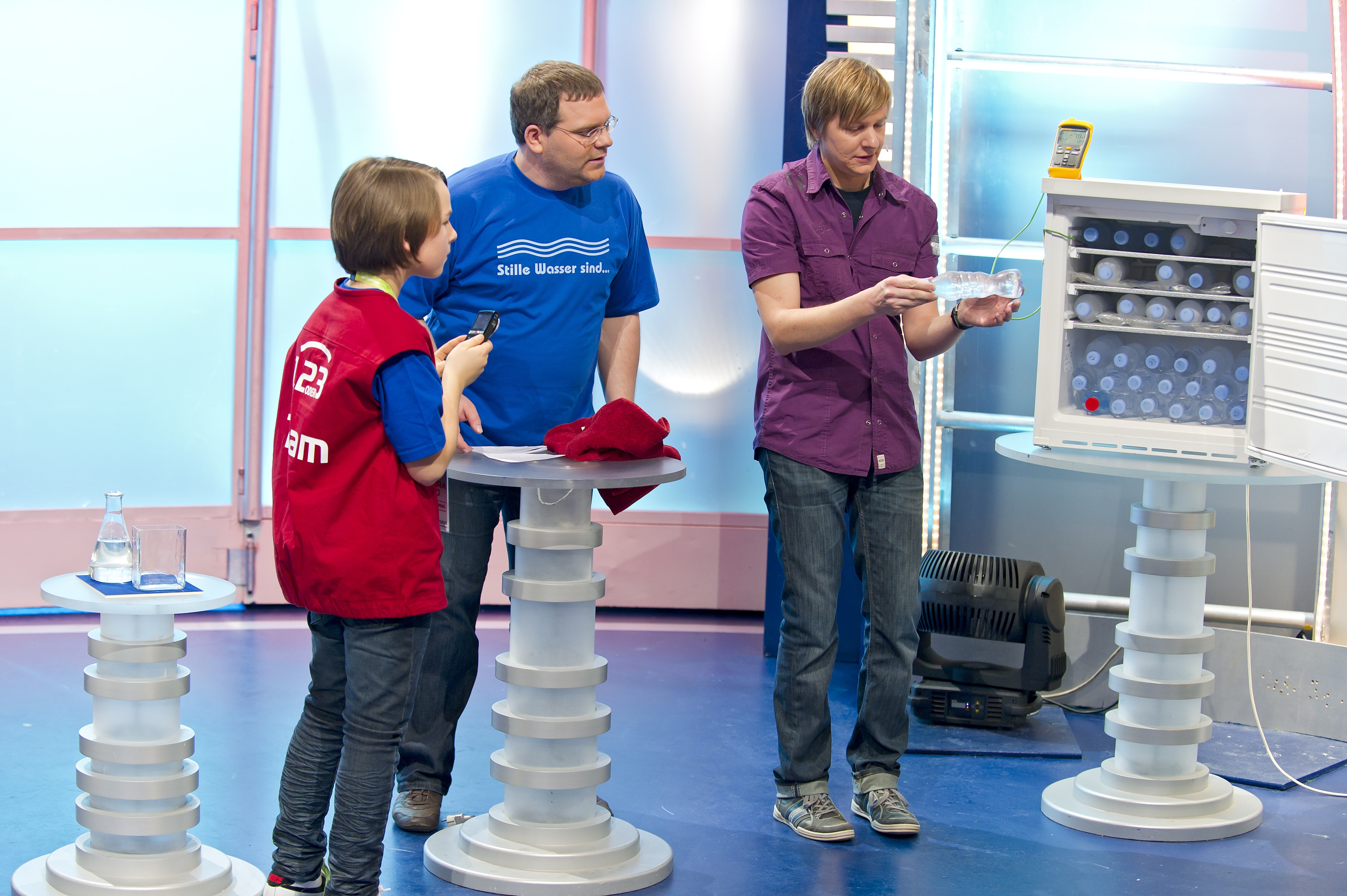 Nach einer aufregenden Generalprobe, in der wie erwartet alles schief ging, war die Spannung vor der Sendung bei allen Beteiligten groß. Doch traditionsgemäß liefen die Experimente in der anschließenden Aufzeichnung der Sendung erfolgreich und problemlos. Die Zuschauer staunten über blitzschnelle Wassertropfen, das Kamerakind verfolgte die Keimbildung des unterkühlten Wasser in Großaufnahme. Die Kandidaten mussten zu den Experimenten in bewährter 1, 2 oder 3-Manier auf drei Feldern hüpfend Fragen beantworten. Nach dem Signal „Ob ihr wirklich richtig steht, seht ihr wenn das Licht angeht“ wurde aufgelöst. Die Kinder überraschten dabei Elton und die Event-Physiker mit ihrem umfangreichen Wissen zu den demonstrierten physikalischen Phänomenen. Die Sendung wird am Samstag im ZDF um 8.25 Uhr und im KIKA um 14.30 Uhr ausgestrahlt. Im Internet ist die Sendung die ganze nächste Woche auf der 1, 2 oder 3-Homepage abrufbar.