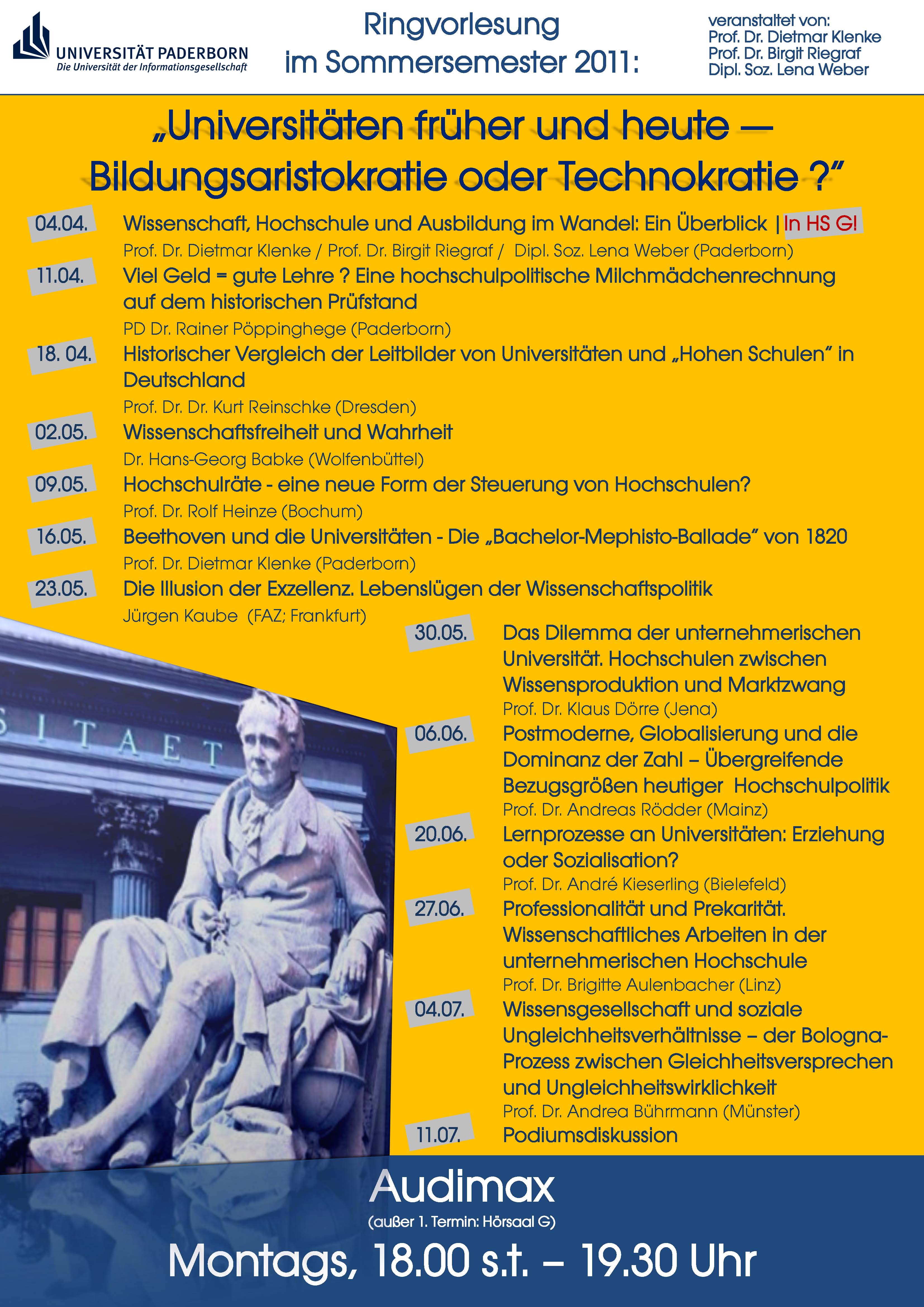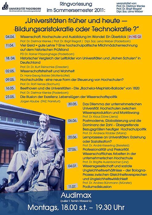 Die Ringvorlesung, organisiert von den Paderborner WissenschaftlerInnen Prof. Dietmar Klenke, Prof. Birgit Riegraf und Dipl. Soz. Lena Weber, nimmt aus dem Blickwinkel historischer und soziologischer Perspektiven die verschiedenen hochschul- und wissenschaftspolitischen Diskurse in Deutschland auf und möchte zu einer breiten Bildungsdebatte inner- und außerhalb der Universität anregen.
