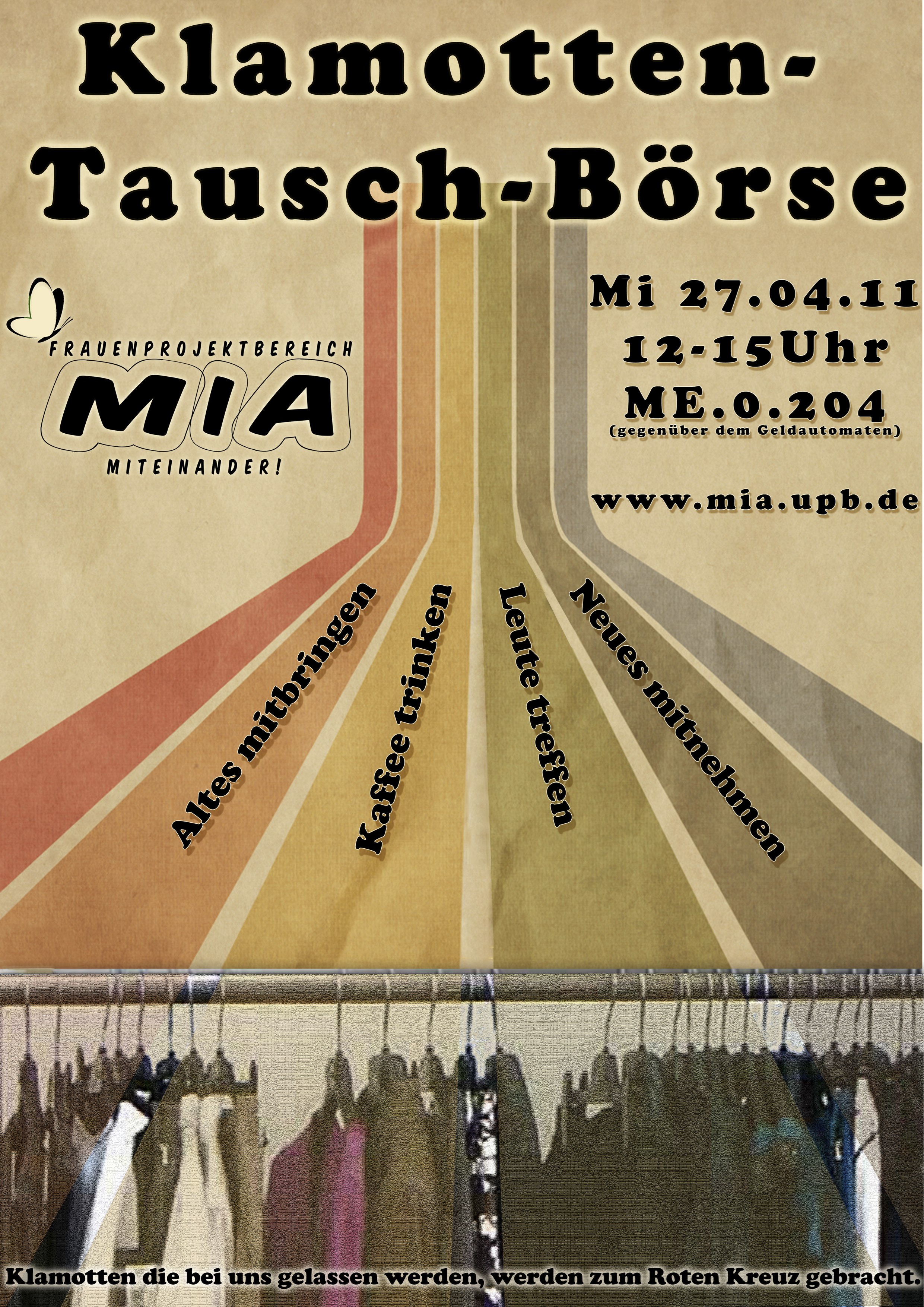 Befindet sich in deinem Kleiderschrank der ein oder andere Fehlkauf oder ein Schmuckstückchen, das du schon lange nicht mehr getragen hast? Wohin mit Klamotten, die dir nicht mehr passen, aber noch zu gut sind zum Wegschmeißen? Du möchtest mal was Neues an- und ausprobieren, ohne ein Vermögen zu bezahlen? Dann komm zur Klamottentauschbörse von MIA. Hier kannst du deine “alten” Sachen eintauschen und lernst gleichzeitig neue Leute kennen.