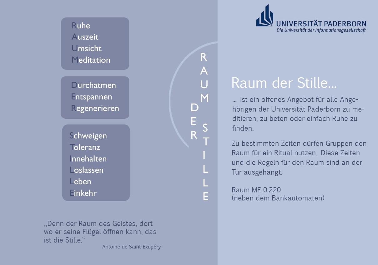 Das im Mai 2010 gegründete Zentrum für Komparative Theologie und Kulturwissenschaft an der Kulturwissenschaftlichen Fakultät der Universität Paderborn hat für die Einrichtung eines Raums der Stille