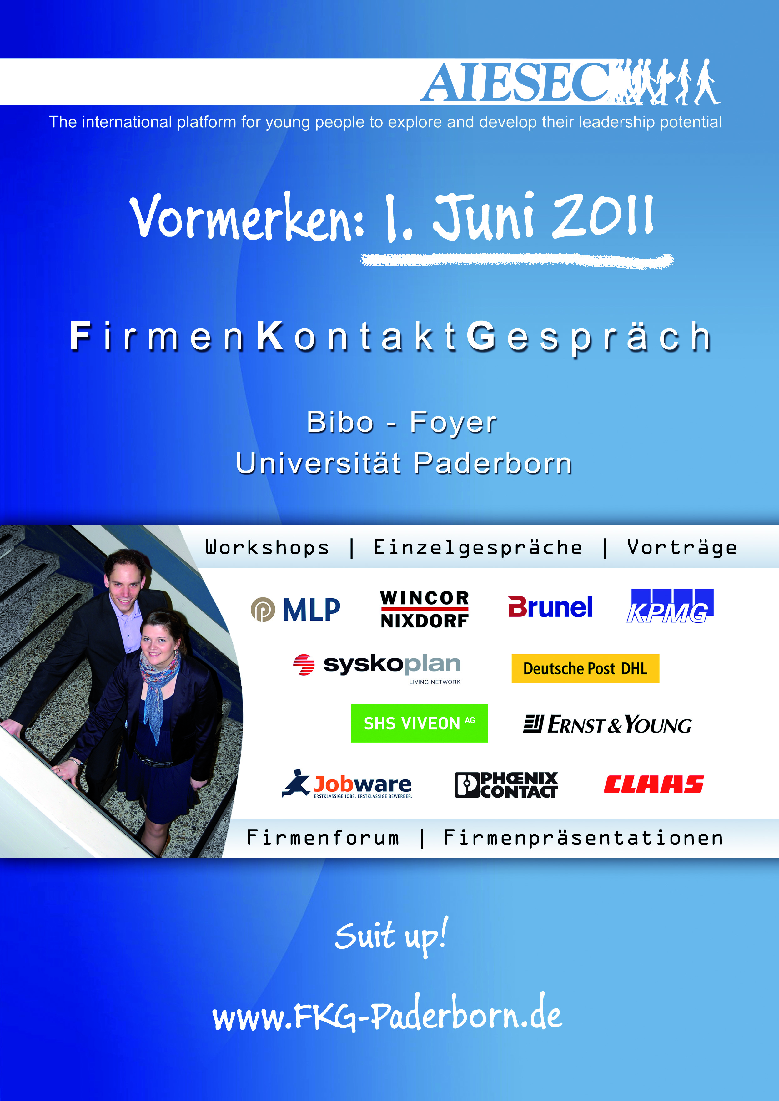 Dieses Jahr findet zum 16. Mal das FirmenKontaktGespräch (FKG) an der Universität Paderborn statt. AIESEC bietet Studenten und Absolventen der Uni Paderborn die Möglichkeit, in Kontakt mit potentiellen Arbeitgebern zu kommen, an Workshops zur Berufsvorbereitung teilzunehmen und sich über die teilnehmenden Firmen zu informieren.