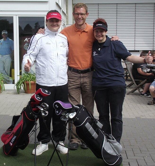 Die Sportart Golf gehört schon länger zu den specialolympischen Disziplinen. Sabrina Heisener (Schlosswerkstätten Paderborn) und Andreas Weddehage (Hermann-Schmidt-Schule Paderborn) haben sich über nationale Wettbewerbe für die Teilnahme qualifiziert. Damit kommen zwei von insgesamt fünf Golfteilnehmern aus Paderborn. Beide Sportler haben vor Jahren den Weg zum Golf über das Projekt "Abschlag Schule" des Deutschen Golf Verbandes in Zusammenarbeit mit der Hermann-Schmidt-Schule und dem Universitäts-Golfclub Paderborn gefunden. Trainer Tim Schrader wünscht seinen Sportlern viel Erfolg und übergibt im Namen des Universitäts-Golfclubs jedem Teilnehmer eine neue Golfausrüstung.