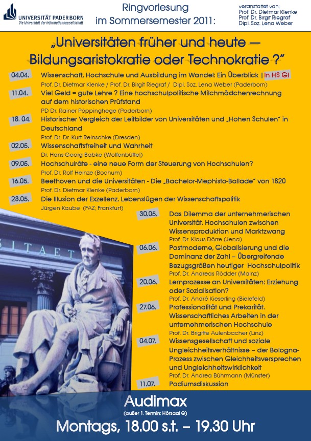 Am Montag, 20.6., 18.00 Uhr, wird im Audimax Prof. Dr. André Kieserling im Rahmen der Ringvorlesung „Universitäten früher und heute - Bildungsaristokratie oder Technokratie“ zum Thema „Lernprozesse an Universitäten: Erziehung oder Sozialisation?“ vortragen. Prof. Kieserling lehrt Allgemeine Soziologie an der Universität Bielefeld. Er veröffentlicht regelmässig in der Frankfurter Allgemeinen Zeitung unter anderem zum Thema, warum die Inhalte eines Studiums bei Studierenden häufig als „uncool“ gelten und gute Studenten ins Abseits geraten.