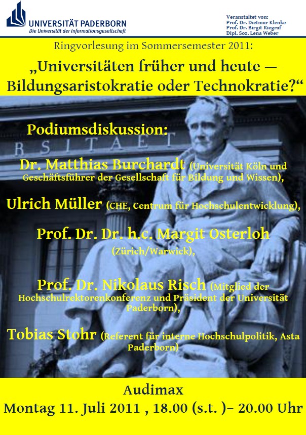 Die Veranstaltung endet um 20.00 Uhr. Einleitend werden die DiskussionsteilnehmerInnen in einem kurzen Statement ihre Einschätzung der gegenwärtigen Umstrukturierungsprozesse an den Hochschulen offen legen. Dann wird die Diskussionsrunde gegenüber dem Publikum geöffnet. Die Diskussionsveranstaltung verspricht zum Abschluss der Ringvorlesung noch einmal spannende Erkenntnisse. Alle Interessierten sind dazu herzlich eingeladen.