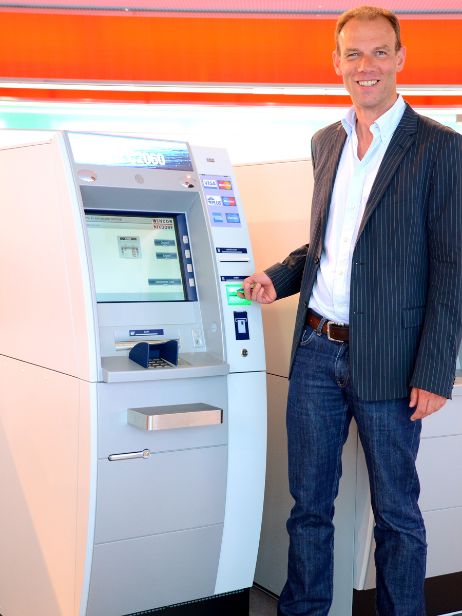 Foto (Stefan Pföhler und Simone Rudolph): Prof. Dr. Johannes Blömer vor einem Geldausgabeautomaten des Projektpartners Wincor Nixdorf.