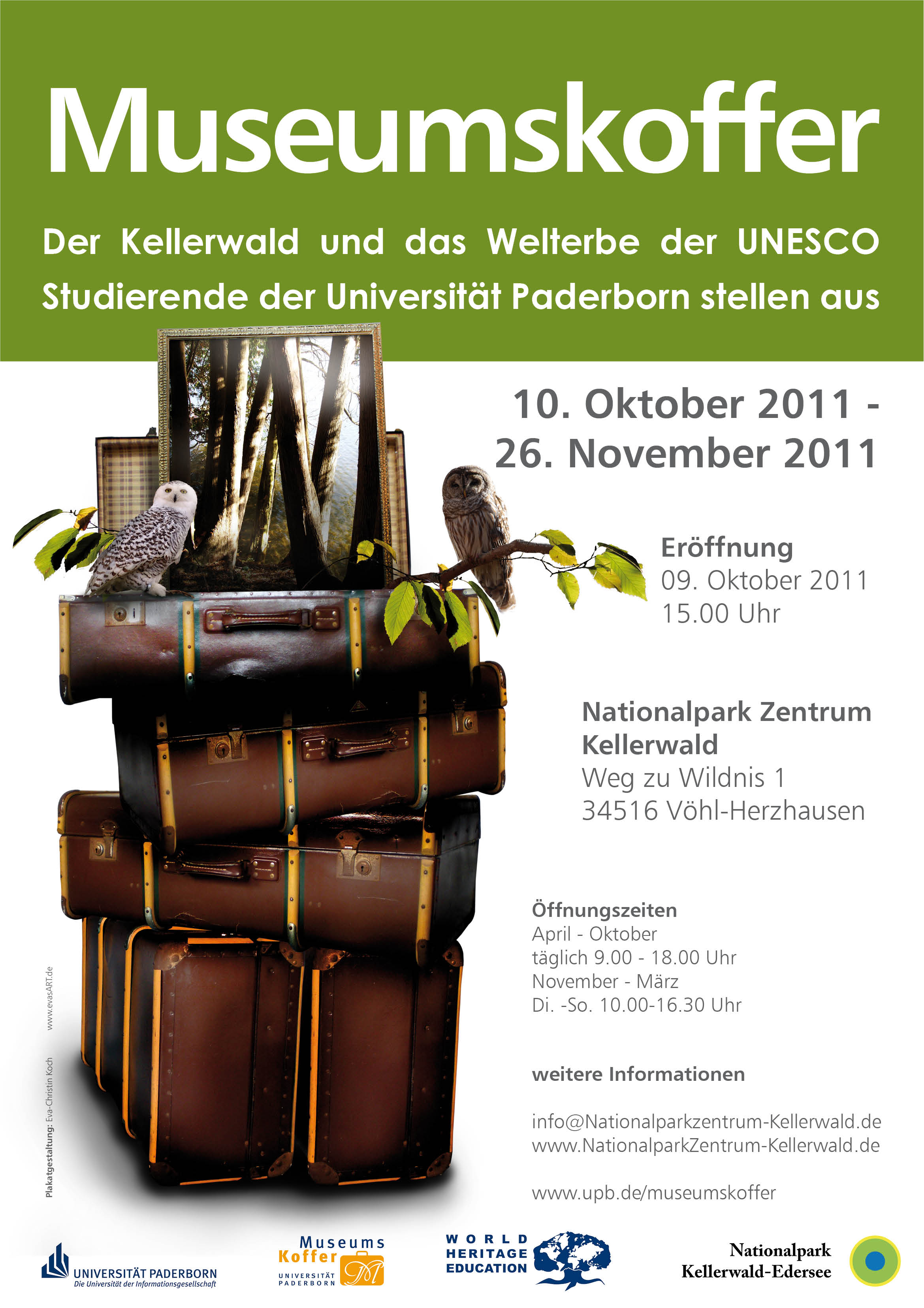 Der nordhessische Nationalpark Kellerwald-Edersee ist mit seinen Buchenwäldern in diesem Jahr UNESCO-Weltnaturerbe geworden. Zu diesem Anlass stellen Studierende des Faches Kunst der Universität Paderborn ihre Museumskoffer, vom 10. Oktober bis zum 26. November 2011, unter dem Titel: „Museumskoffer. Der Kellerwald und das Erbe der UNESCO“ im Nationalpark Zentrum Kellerwald in Vöhl-Herzhausen (bei Korbach) aus.