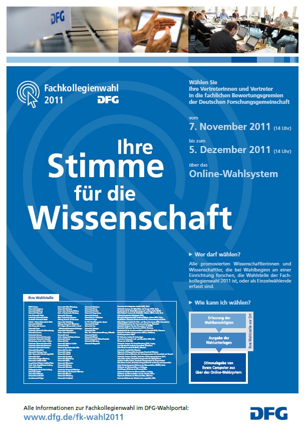 Vom 7. November 2011 (14.00 Uhr) bis 5. Dezember 2011 (14.00 Uhr) findet die diesjährige Online-Wahl zu den DFG-Fachkollegien statt. Gewählt werden die Vertreterinnen und Vertreter in die fachlichen Bewertungsgremien der DFG.