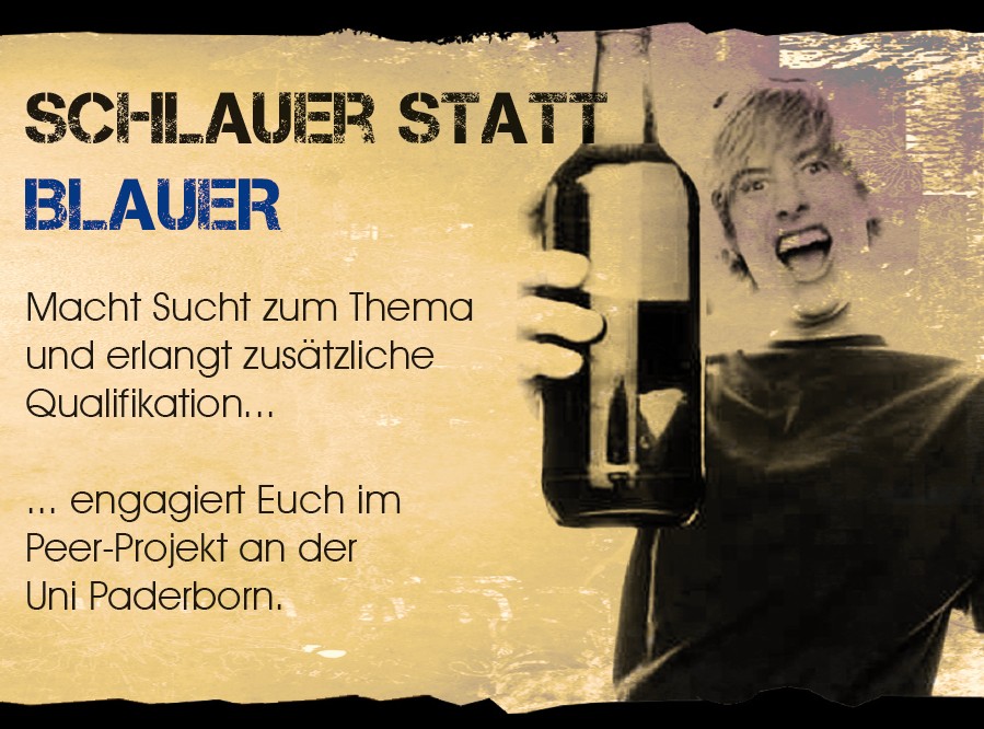 Und für alle Studis: Informieren Sie sich über das Projekt "Schlauer statt blauer" mit dem Sie sich engagieren und fortbilden können. Nähere Informationen finden Sie im <link fileadmin aktuelles pressefotos oktober plyer_peer_projekt_2011_2012.pdf _blank>Flyer.