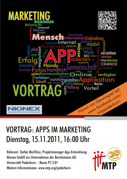 Der MTP – Marketing zwischen Theorie und Praxis e.V. ist Deutschlands größte studentische Marketinginitiative und veranstaltet zusammen mit der Nionex GmbH, einem Unternehmen der Bertelsmann AG, einen spannenden Vortrag zum Thema „Mobile Applikationen und ihr Einzug in den Marketing-Mix der Unternehmen“. Die Veranstaltung findet am Dienstag, 15.11.2011, von 16:00 bis 18:00 Uhr im Raum P7.2.01 der Uni Paderborn statt.