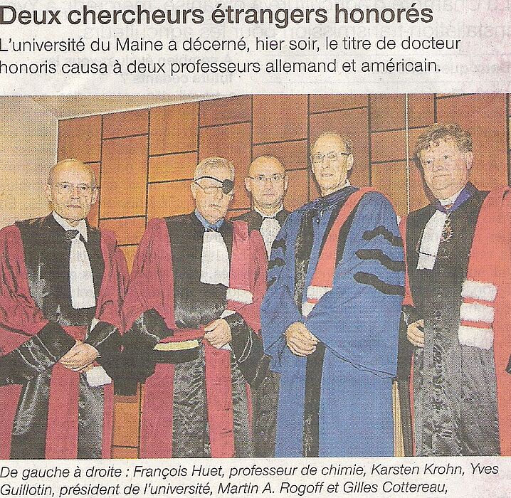 Vom 23. bis 25.11.2011 war eine Delegation von der Universität Paderborn an der langjährigen Partnerhochschule in Le Mans zu Gast. Neben zahlreichen Gesprächen in den einzelnen Fachbereichen über zukünftige Kooperationsprojekte war der zentrale Anlass der Reise die Verleihung der Ehrendoktorwürde der Université du Maine an Prof. em. Dr. Dr. h. c. Karsten Krohn, Universität Paderborn. Krohn hat jahrelang die partnerschaftlichen Beziehungen zwischen den beiden Universitäten in der Chemie gepflegt und Studierende und Doktoranden aus Le Mans in Paderborn betreut sowie Paderborner Chemiestudierende zu Studienaufenthalten nach Le Mans gesandt. Die Ehrung fand am 24.11. im festlichem Rahmen im Amphitheatre der Universität Le Mans statt.