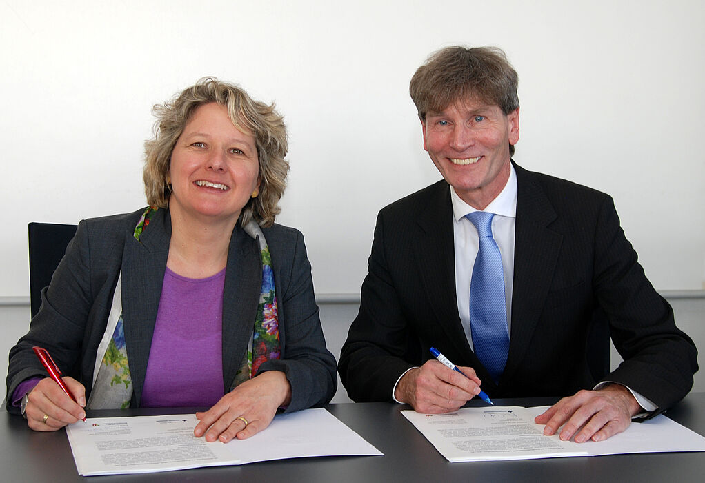 Foto (Norma Langohr): NRW-Wissenschaftsministerin Svenja Schulze und Präsident Prof. Dr. Nikolaus Risch unterzeichnen die Zielvereinbarung.