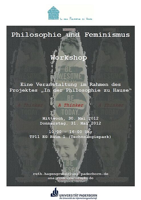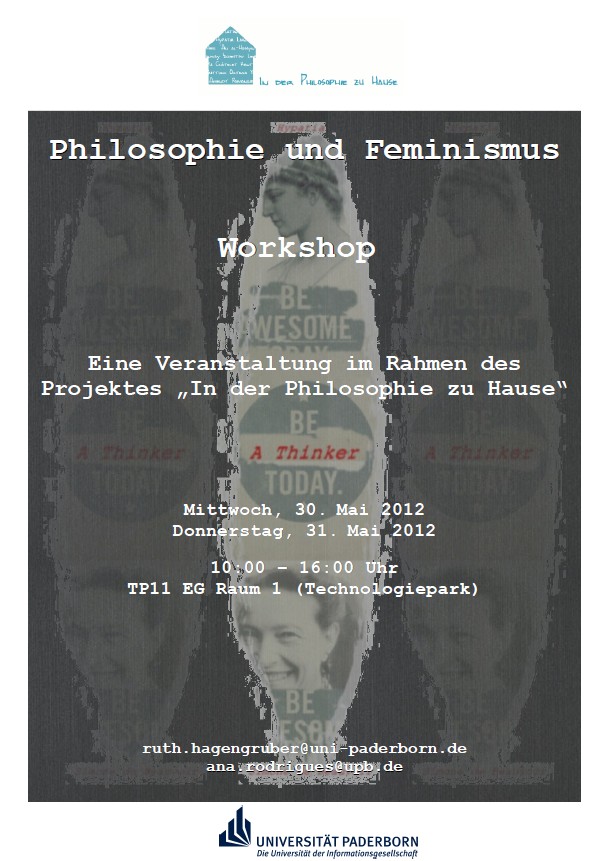 Das Projekt In der Philosophie zu Hause des Instituts für Humanwissenschaften der Universität Paderborn veranstaltet im Rahmen der Lesewoche der Fakultät für Kulturwissenschaften am Mittwoch, den 30.05.2012, und Donnerstag, den 31.05.2012, einen Workshop zum Thema Philosophie und Feminismus.