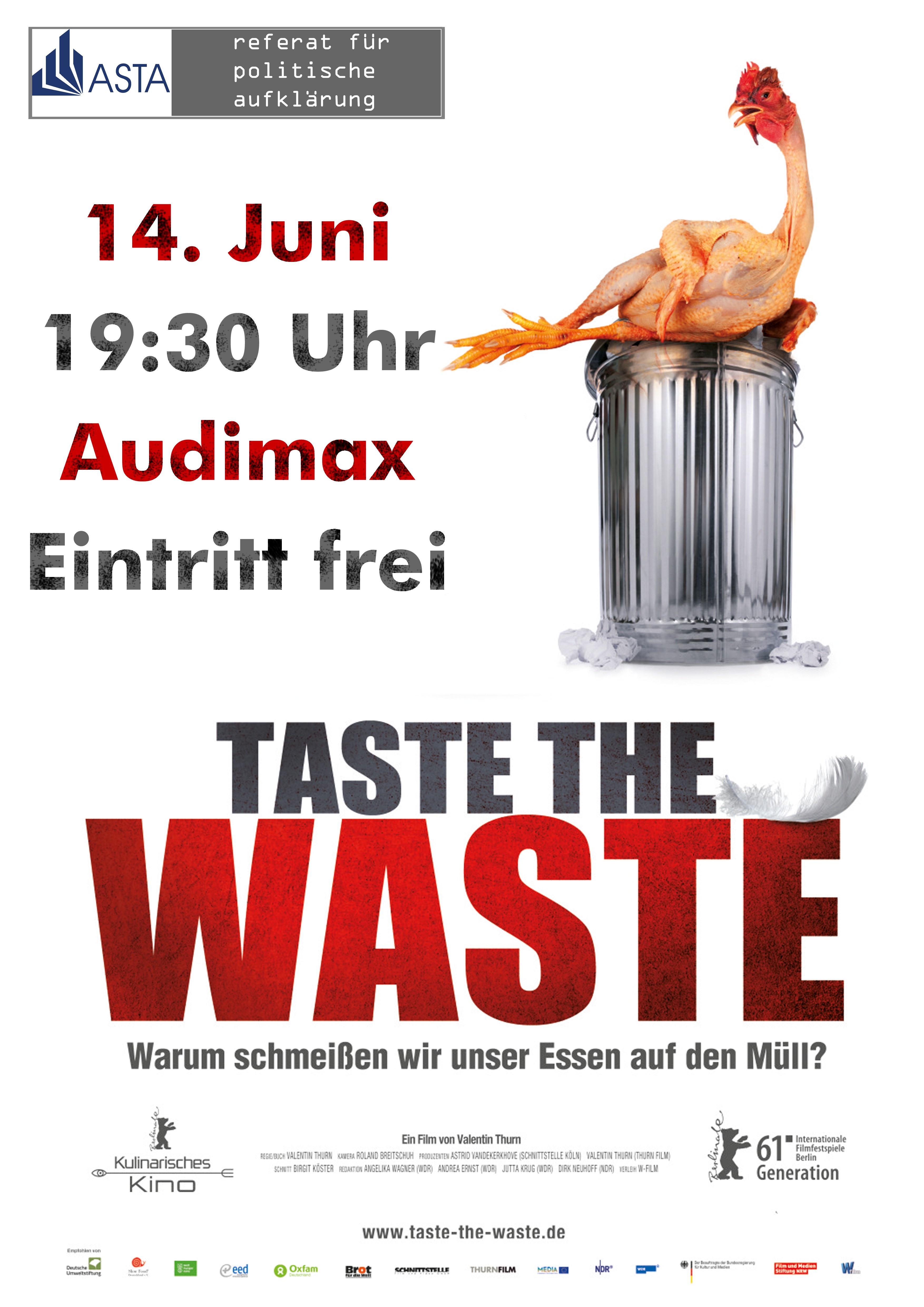 Der AStA Paderborn zeigt am Donnerstag, 14. Juni, um 19.30 Uhr, den Film „Taste the waste“ im Auditorium Maximum der Universität Paderborn. Der Film bekam im Vorfeld, aber auch während seiner Ausstrahlung im September und Dezember des vergangenen Jahres, ein hohes Medienecho und wurde unter anderem in Sendungen wie Stern TV thematisiert.