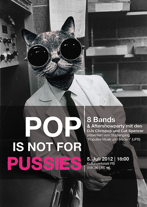 Pünktlich zum Ende des Sommersemesters lässt der Studiengang "Populäre Musik und Medien" (Universität Paderborn) am 5. Juli die Katze aus dem Sack. In der Kulturwerkstatt/Paderborn präsentieren die Studenten musikalische Highlights aus den eigenen Reihen: acht Live-Bands statt sieben Leben und Schallwellen statt Rumgeschnurre, getreu dem Motto "POP IS NOT FOR PUSSIES"!