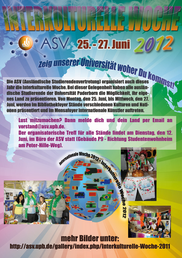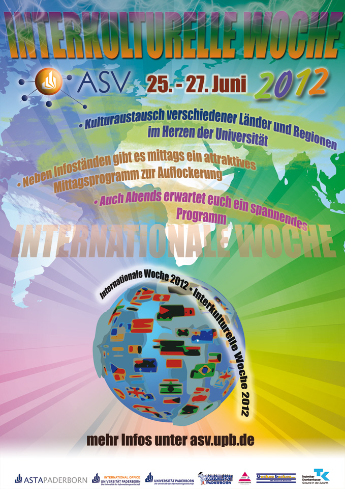 Auch dieses Jahr lädt die ASV (Ausländische Studierenden Vertretung) zur Interkulturellen Woche ein. Von Montag, den 25. Juni, bis Mittwoch, den 27. Juni, werden im Mensa- und Bibliotheksfoyer der Universität Paderborn verschiedene Länder ihre Kultur präsentieren.