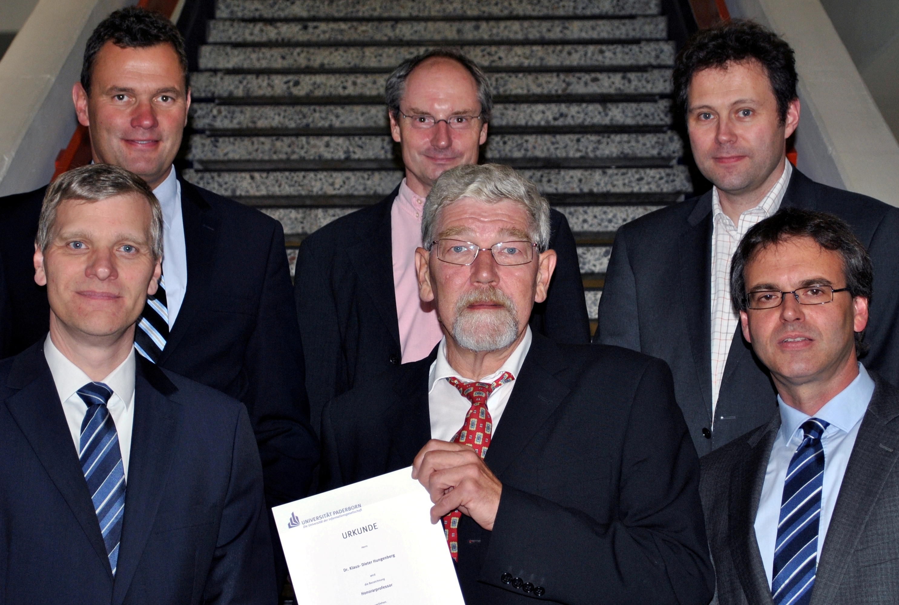 Dr. Klaus Dieter Hungenberg (BASF SE) wurde jetzt die Urkunde zur Verleihung des Titels „Honorarprofessor“ an der Universität Paderborn überreicht. Übergeben wurde die Urkunde durch Prof. Dr. Volker Schöppner, Dekan der Fakultät für Maschinenbau, Prof. Dr. Torsten Meier, Dekan der Fakultät für Naturwissenschaften, und Prof. Dr. Elmar Moritzer, Vorsitzender des PMP (Institut für Polymere Materialien und Prozesse). Die Verleihung der Honorarprofessur an Dr. Hungenberg ist eine Würdigung seines langjährigen erfolgreichen Einsatzes für die Universität Paderborn in Lehre und Forschung. Bereits seit 2003 ist Hungenberg in der Technischen Chemie aktiv und gibt in Vorlesungen sein Wissen auf dem Gebiet der Polymer-Reaktions-Technologie mit Begeisterung an die Studierenden weiter.