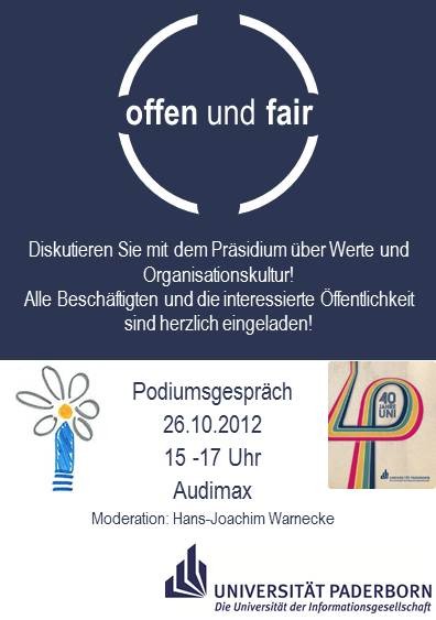 Sehr geehrte Damen und Herren, liebe Kolleginnen und Kollegen, das Präsidium lädt Sie hiermit herzlich zum Podiumsgespräch „Offen und fair: Werte und Kultur an der Universität Paderborn“ am heutigen Freitag, 26.10.2012, von 15.00 bis 17.00 Uhr in das Auditorium maximum ein. Nutzen Sie diese Chance, sich an der Diskussion zu beteiligen und die Initiative Werte und Kultur mitzugestalten, oder hören Sie gern auch einfach zu. Die Moderation übernimmt Prof. Dr. Hans-Joachim Warnecke.