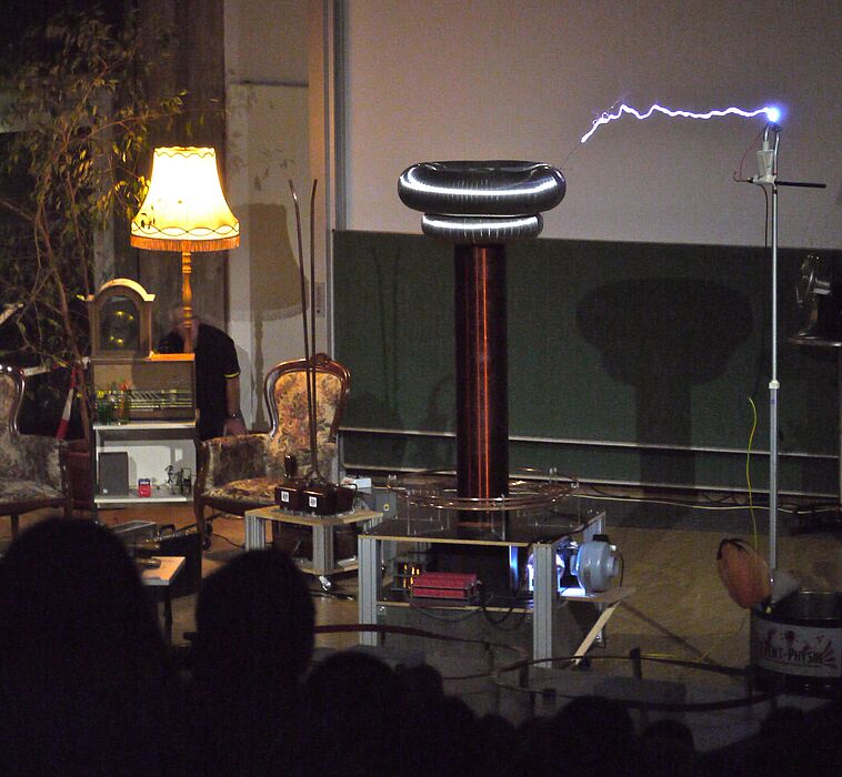 Fehlten noch die Stichworte „Feuerwerk“ und „Entertainment“, für die es die Event-Physiker dann so richtig krachen ließen: Zu Anfang beeindruckten die Blitze aus einer 2,40 Meter hohen Tesla-Spule. Vor den Augen des staunenden Publikums ließen die Physiker dann ein „Tischfeuerwerk XXL“ mit einem gewaltigen Knall hochgehen, der einen Riesenschauer bunter Styroporflocken und Tischtennisbälle auf das Team niederregnen ließ. Mit der abschließenden Lasershow zum Klassiker von John Miles kündigte Sacher für 2014 eine neue Show zum Thema „Musik“ an. Bis dahin versprach er, die Show „Wie Physiker eine Party feiern“ aufgrund der enormen Kartennachfrage in 2013 zu wiederholen.