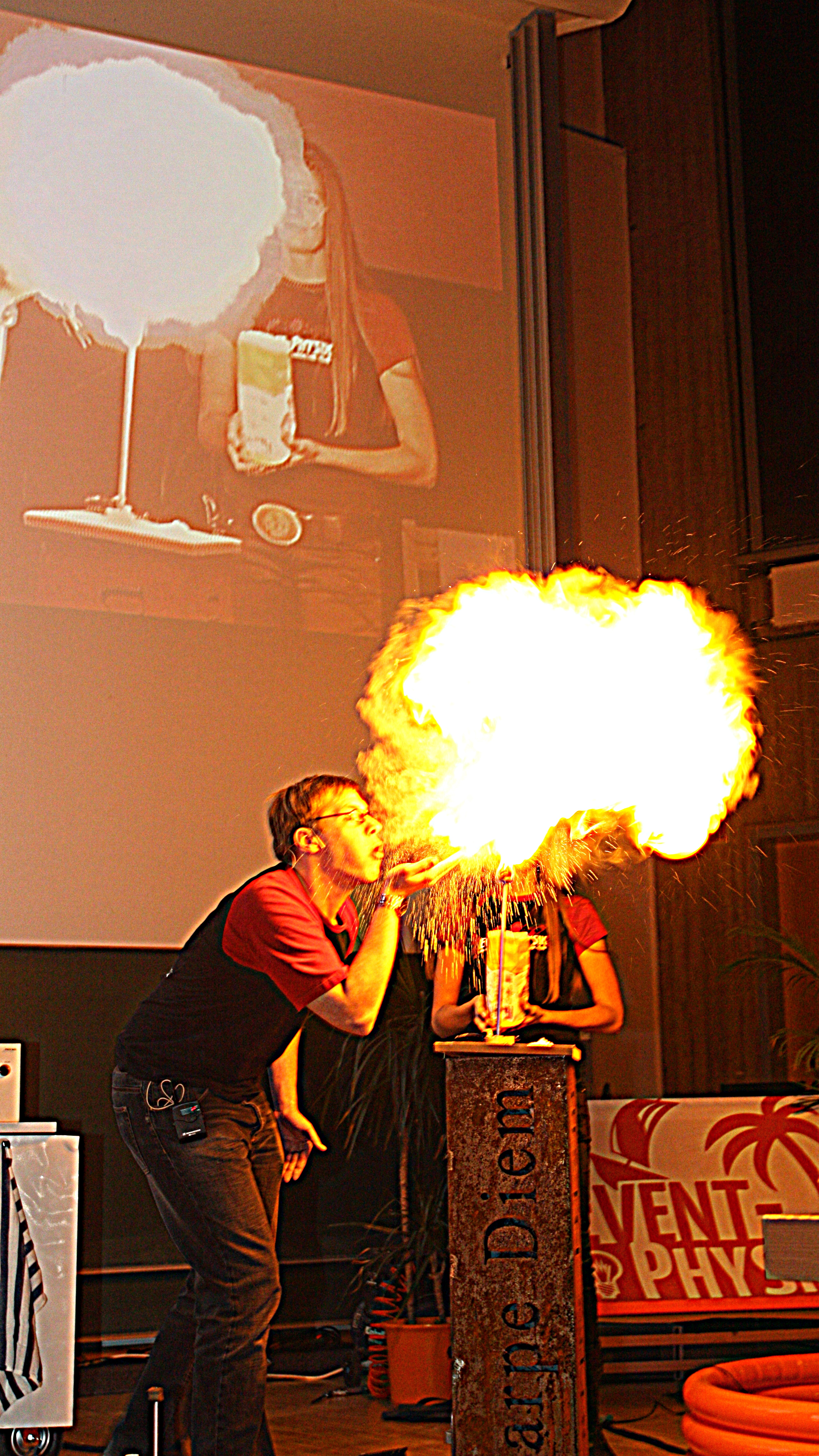 „Dekoration und Beleuchtung, Verpflegung, Feuerwerk, Spiele und Entertainment, all das braucht man für eine gute Party“, erklärte Moderator Marc Sacher zu Beginn seine Party-Mindmap. Eigentlich nichts Neues, doch dann bewiesen die Event-Physiker, wie man die Liste auch in die Tat umsetzen kann. Ein zwei Meter hoher Feuertornado ersetzte Heizpilz und Kerzenschein. Mehl, zerstäubt und entzündet in einer pfiffigen Konstruktion, sorgt für beeindruckende Feuerbälle. Und die langweilige Lichterkette ersetzten die Event-Physiker kurzerhand durch Glühbirnen ohne Glas, die in flüssigem Stickstoff leuchteten, oder gasgefüllte Glasbirnen, die in der Mikrowelle buntes Licht erzeugten.