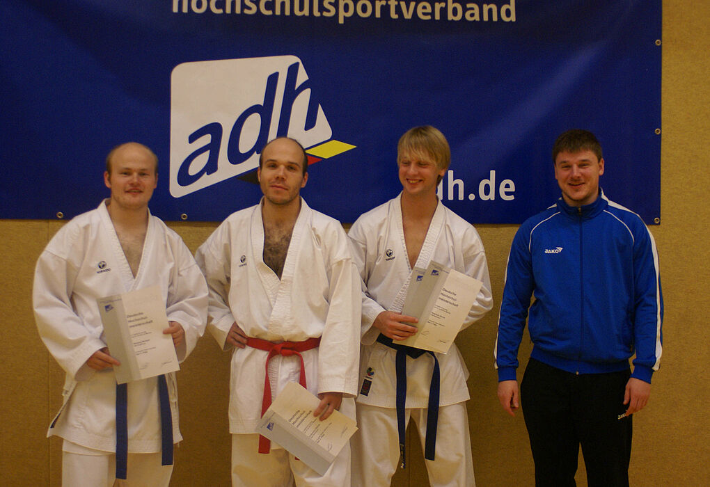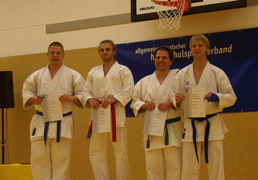 Die beiden zeigten jedoch eindrucksvoll, was sie drauf haben. Die Universität Karlsruhe wurde mit mit 2 Siegen bezwungen, gegen die Universität Kassel gab es eine 1:2 Niederlage, die Universität Leipzig wurde mit 2:1 besiegt und im Kampf um den dritten Platz konnte auch die Ruhr-Universität Bochum mit 2:1 besiegt werden. Außerdem konnte Dennis Dreimann im Kumite bis 75 kg die Silbermedaille und Bernd Nowotzin in der Kata die bronzene Medaille gewinnen, während Michael sich im Kumite-Einzel bis 67 kg mit dem 5. Platz zufrieden geben musste.