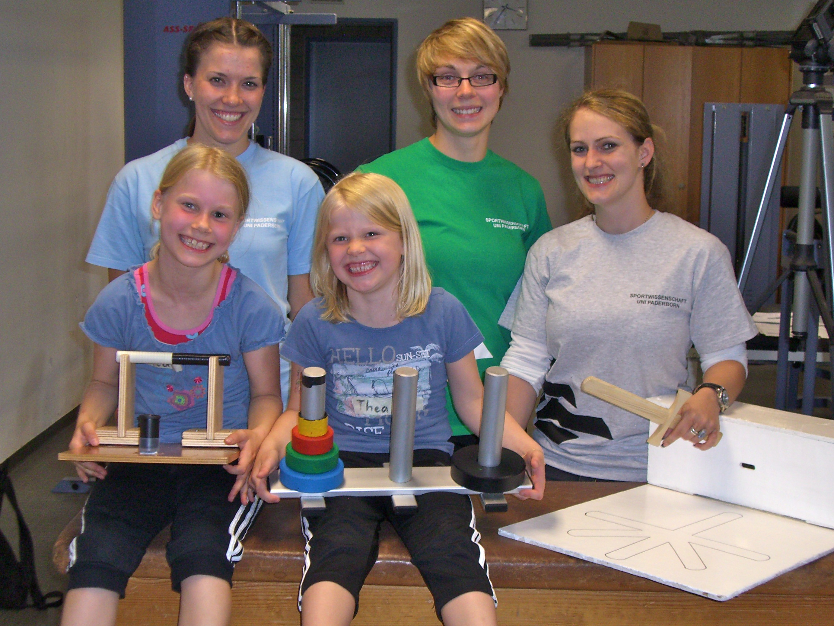 Um eine Antwort auf diese Frage zu finden, entwarf die Doktorandin gemeinsam mit Prof. Dr. Matthias Weigelt die durchzuführende Studie. An sechs Stationen werden die motorischen und kognitiven Fähigkeiten der Kinder auf spielerische Art und Weise untersucht. Beim „Rittertest“ muss ein Schwert aus unterschiedlichen Positionen in eine Öffnung geschoben werden, das Spiel „Turm von Hanoi“ testet die strategische Planungsfähigkeit der Kinder. Ein Pilottest im Mitmach-Museum „Dynamikum“ in Pirmasens und eine Testreihe während der Ferienspiele in Herford brachten erste Ergebnisse und den teilnehmenden Kindern viel Spaß.