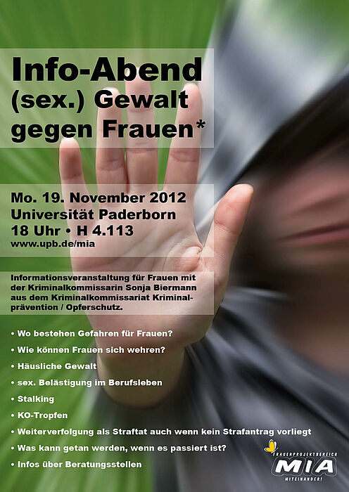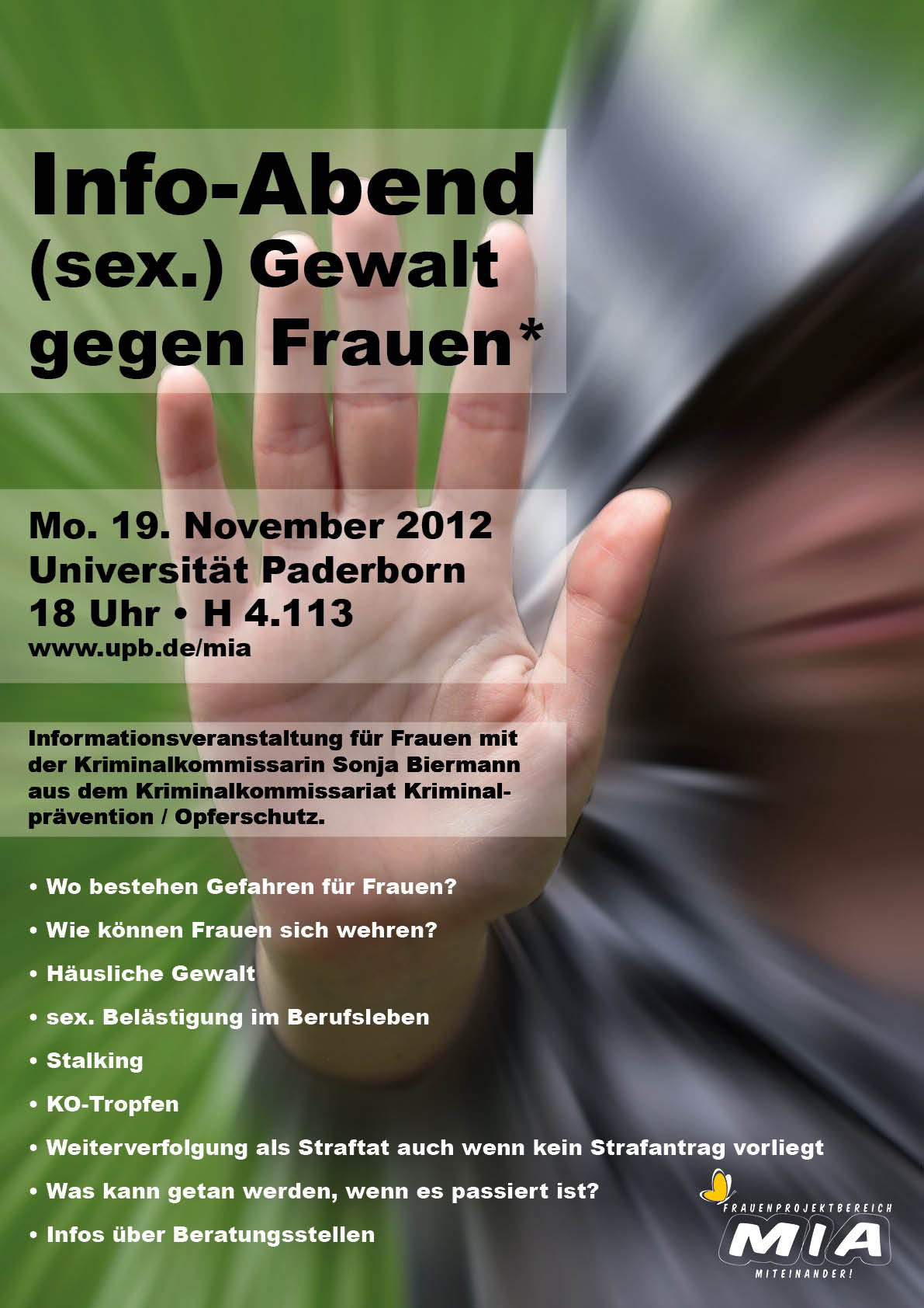 Frauenprojektbereich MIA der Universität Paderborn: Informationsveranstaltung für Frauen über sexuelle Gewalt am Montag, 19. November 2012, um 18 Uhr in H4.113