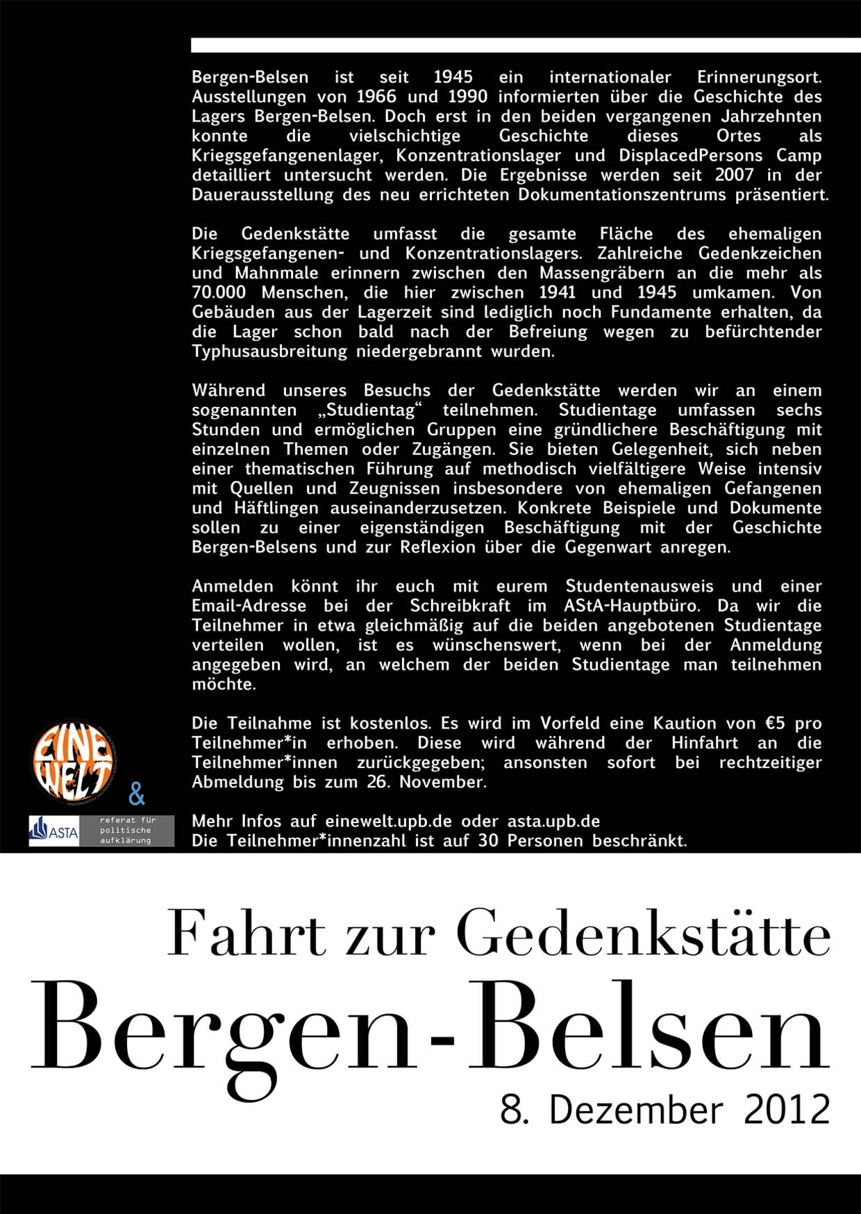Fahrt zur Ge­denk­stät­te Ber­gen-Bel­sen am 8. De­zem­ber – Ex­kur­si­on des Pro­jekt­be­rei­ches „Ei­ne Welt“ und des AS­tA Pa­der­born