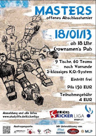Das Wintersemester neigt sich dem Ende zu und so auch die aktuelle Saison der Slider Kickerliga. An 7 Spieltagen wurde erneut um den Einzug in die Playoffs gekämpft, die am 8. Januar im Markandu stattfinden und über die Abschlusstabelle entscheiden. Den großen Saisonabschluss bildet traditionsgemäß das Masters-Abschlussturnier, bei dem jeder mitspielen kann, egal ob Ligaspieler oder Hobbykicker. In diesem Semester findet das Masters am 18. Januar 2013 im Gownsmen's Pub der Uni Paderborn statt.