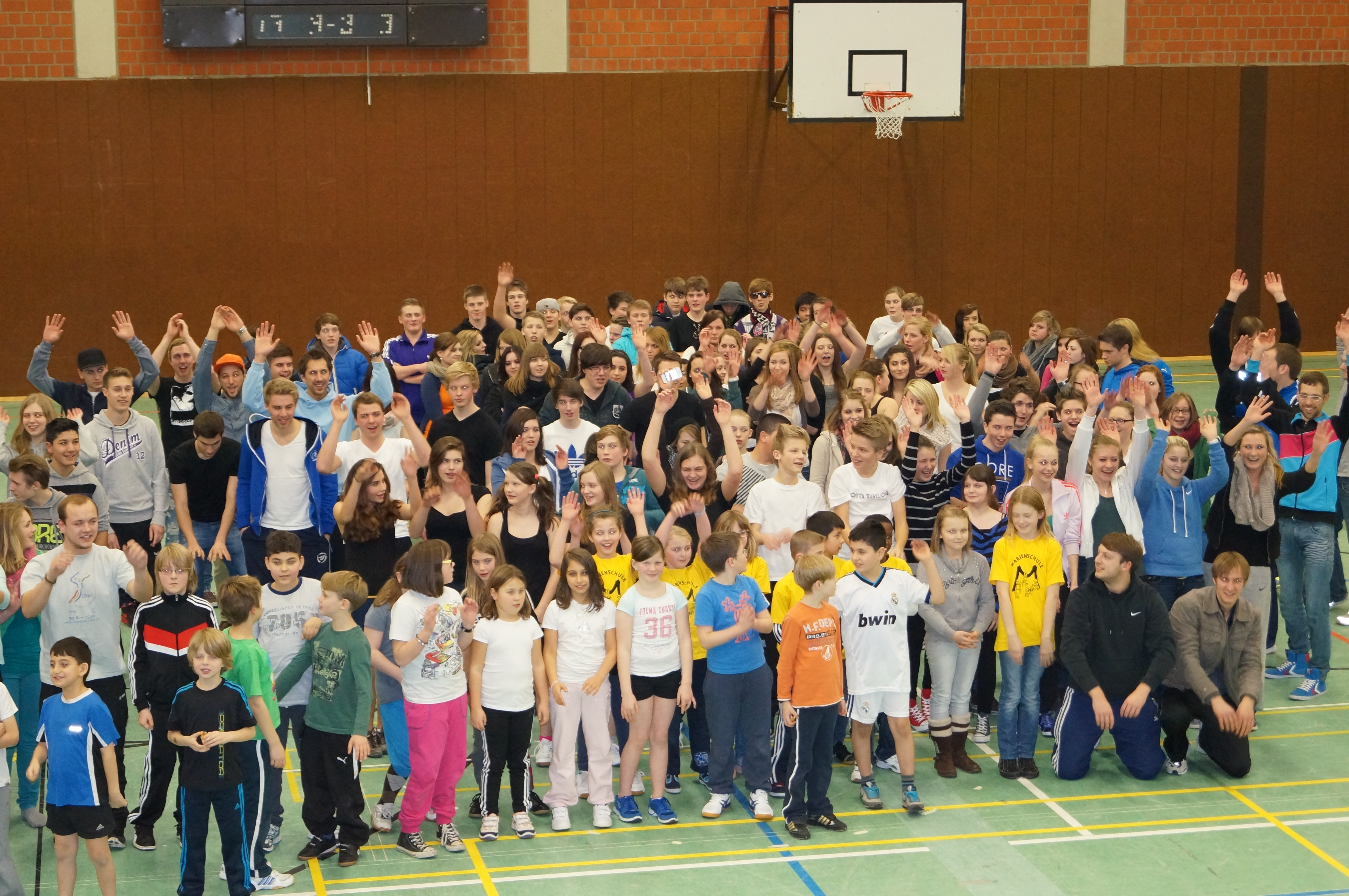 Die Sportstudenten David Sels, Leo Padberg, Jens Behnke, Robin Willeke hatten in den vergangenen zwei Monaten mit den Kindern gearbeitet und in ihrer ausdrucksstarken Choreographie verschiedene Sportarten vertanzt. Natürlich fehlte auch nicht der „Gangnam Style“. Sowohl die Schülerinnen und Schüler 8 e des Gymnasiums Schloss Neuhaus wie auch der 10 b der Lise-Meitner-Realschule fegten zu dem Pferdetanz des südkoreanischen Rappers Psy über das Parkett. Ebenfalls mit dabei: eine 4. Klasse der Marienschule; zwei 8. Klassen sowie die Stufe 11 des Gymnasiums Schloss Neuhaus.
