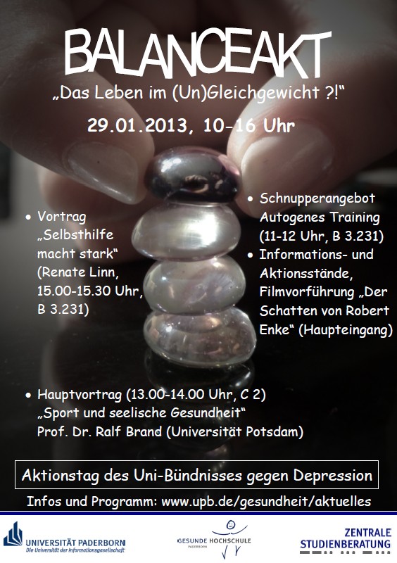 wir laden Sie herzlich ein zum Aktionstag "Balanceakt – Das Leben im (Un-)gleichgewicht?!", der am 29.1.2013 von 10.00 bis 16.00 Uhr im Uni-Foyer stattfinden wird.