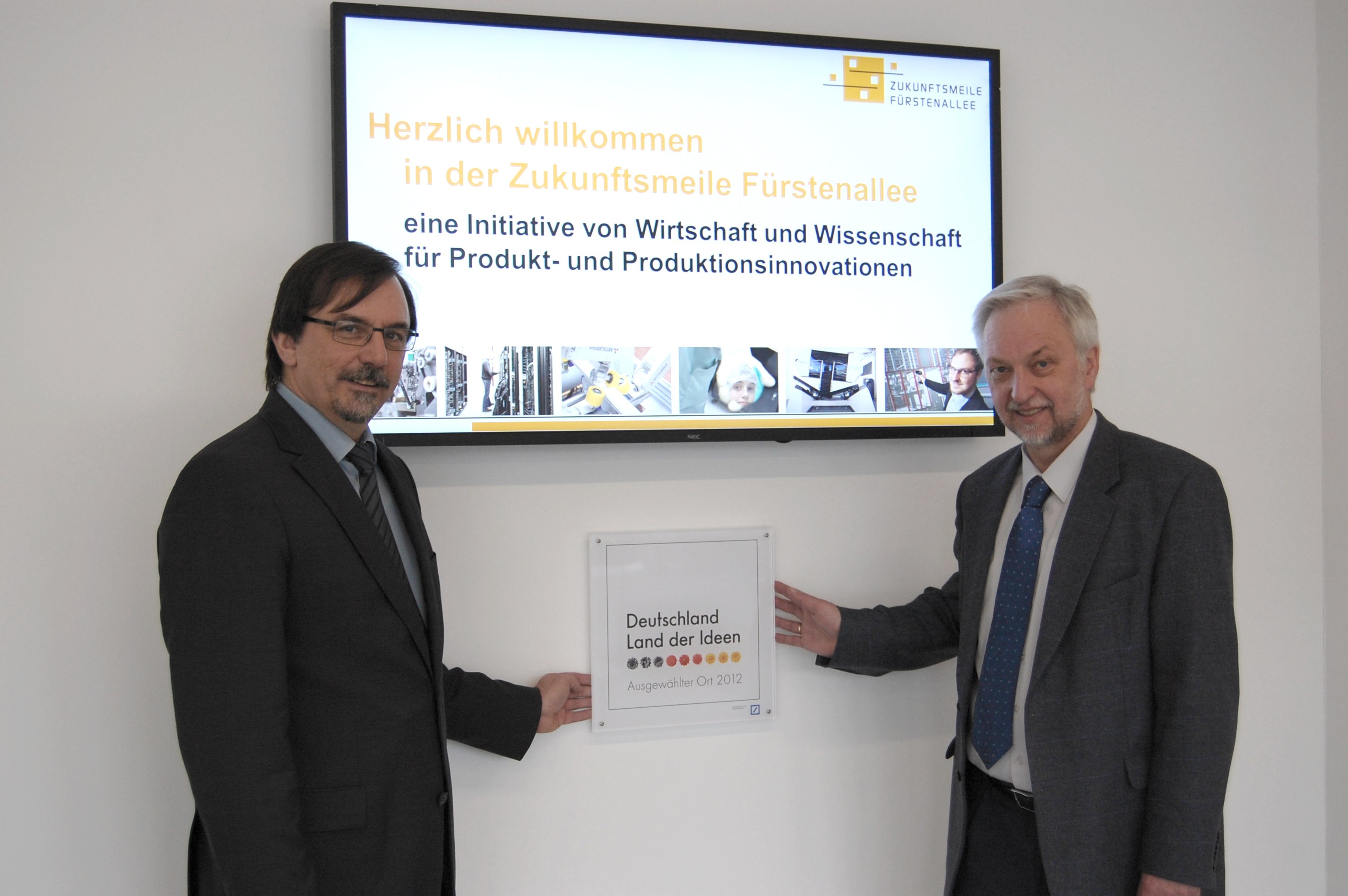 Mit der Übergabe der Ehrentafel an die Preisträger im Wettbewerb „365 Orte im Land der Ideen“ 2012 ist die Adresse „Zukunftsmeile 1“ jetzt offiziell sichtbar ein ausgezeichneter Ort für Ideen und Innovation.