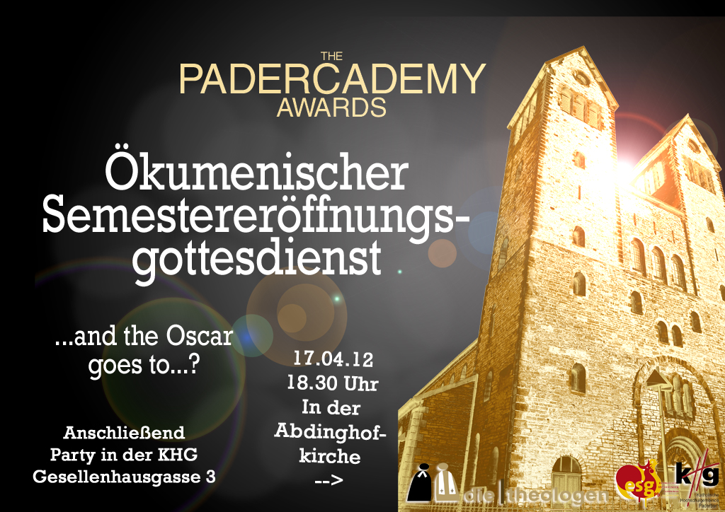Der ökumenische Semestereröffnungsgottesdienst für die Universität Paderborn ist mittlerweile eine gute Tradition. Selbstverständlich darf er auch zum Start des Sommersemesters 2013 nicht im Kalender fehlen: Er findet statt am Mittwoch, 17. April 2013 ab 18.30 Uhr in der Paderborner Abdinghofkirche. Die Predigt wird Prof. Dr. Rita Burrichter vom Institut für katholische Theologie halten; das Thema des Gottesdienstes lautet "The Padacademy Awards - and the Oscar goes to...". Bei der Planung und Durchführung des Gottesdienstes kooperieren ESG, KHG, die Institute für evangelische und katholische Theologie und der ökumenische Fachschaftsrat Theologie. Anschließend wird zum Empfang in die KHG (Gesellenhausgasse 3) eingeladen.