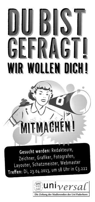 die universal sucht neue Mitglieder! Wir möchten euch daher kurz auf den Infoabend der "universal - Die Zeitung der Studierenden der Uni Paderborn" aufmerksam machen. Dieser findet am Dienstag, den 23.04.2013 um 18 Uhr im Raum C3.222 statt.